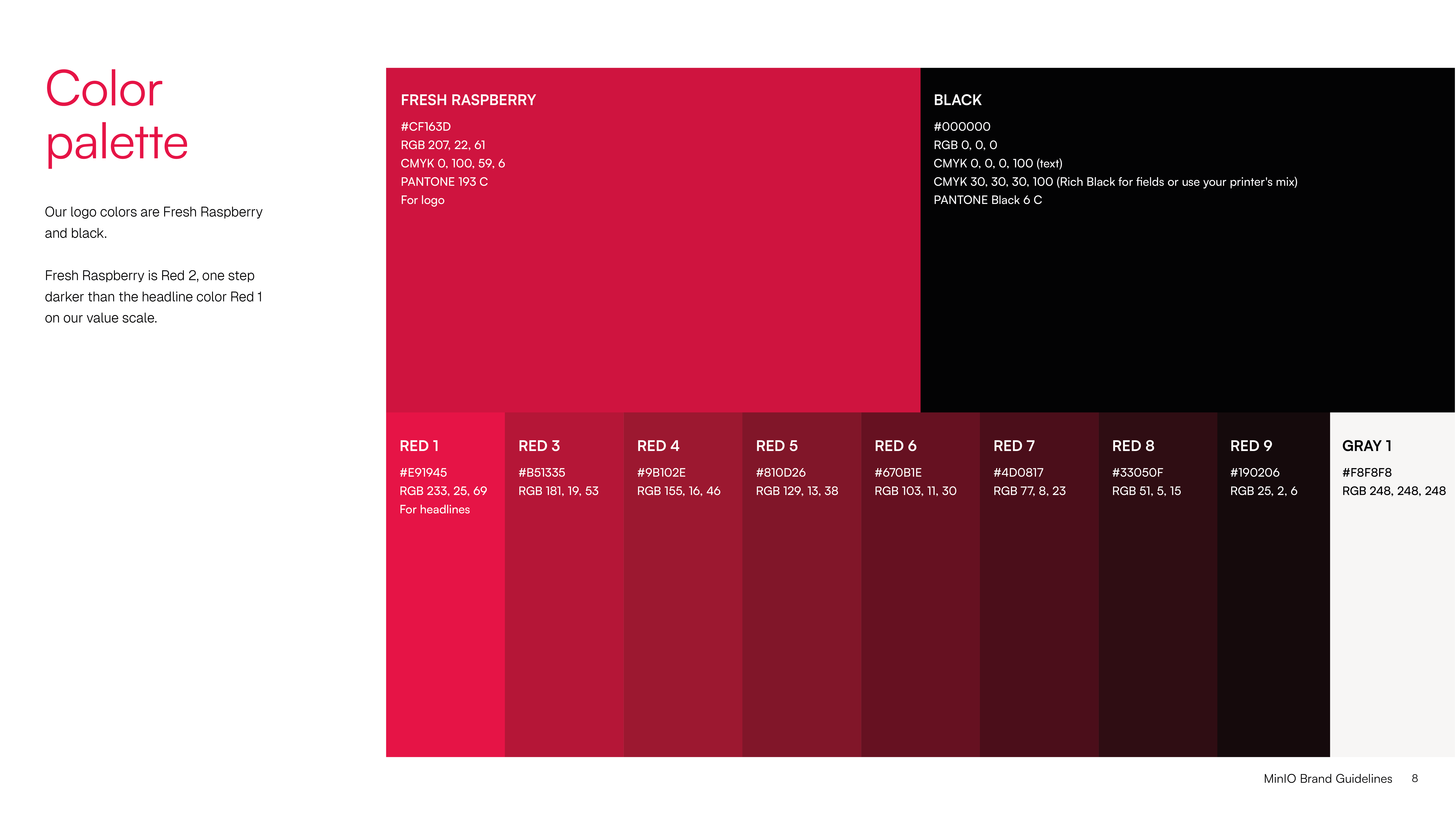 Our signature brand color is a bold Fresh Raspberry. Our secondary colors are mix of strong, dramatic darks and fresh pleasing brights.